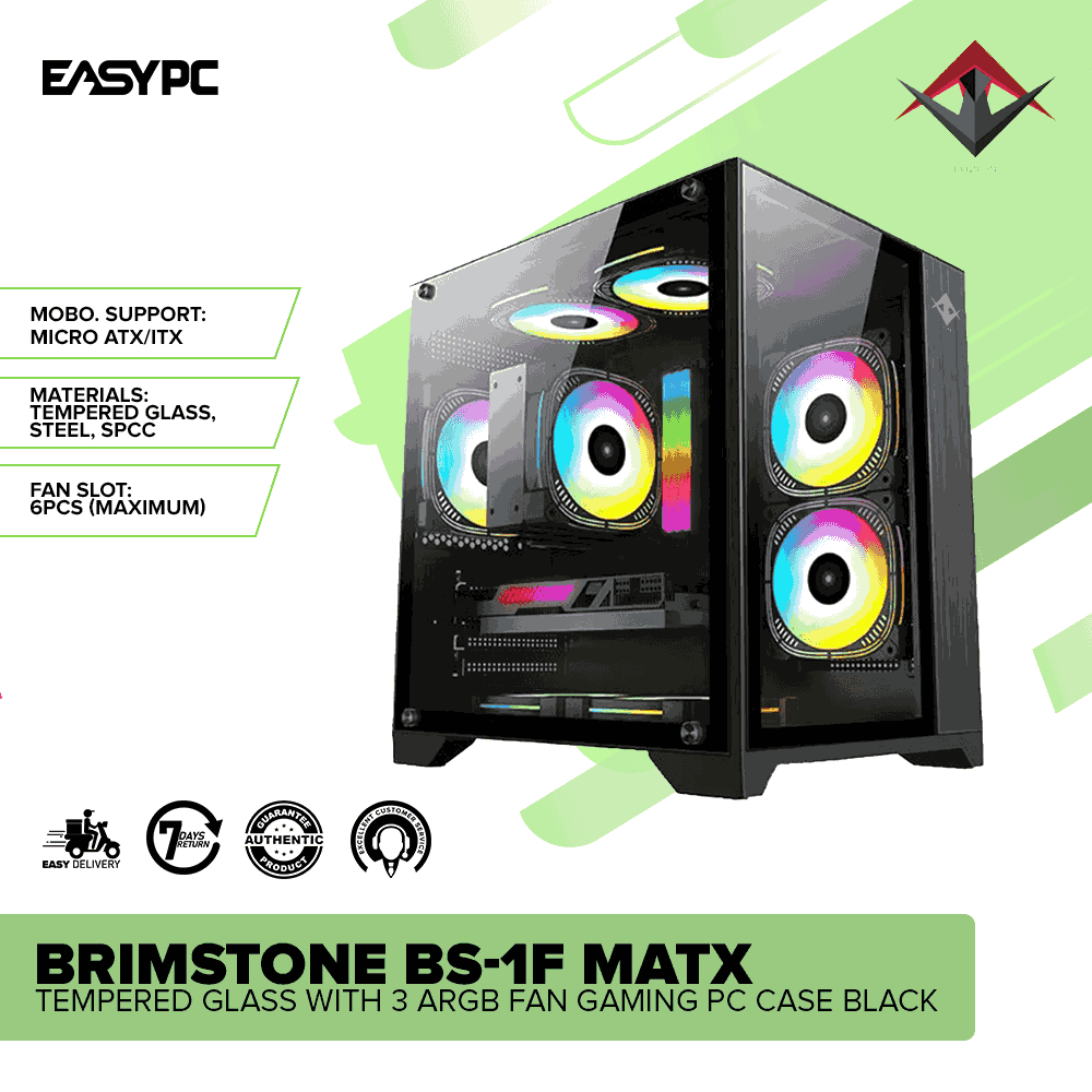 The Fuzion BRIMSTONE BS-1F mATX Gaming PC Case in Black features a sleek tempered glass side panel and 3 pre-installed ARGB fans for vibrant lighting. It offers excellent airflow, supports high-end components, and has a compact design with cable management, making it for stylish and efficient gaming builds.