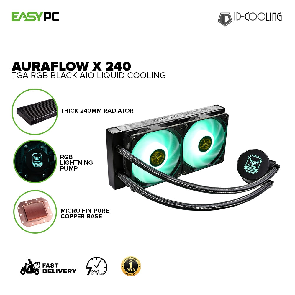 - ID Cooling Auraflow X 240 TGA AIO RGB Sync with motherboard, RGB Pump & Fan Copper Base High Pressure Pump Intel & AMD Liquid Cooling RGB Black